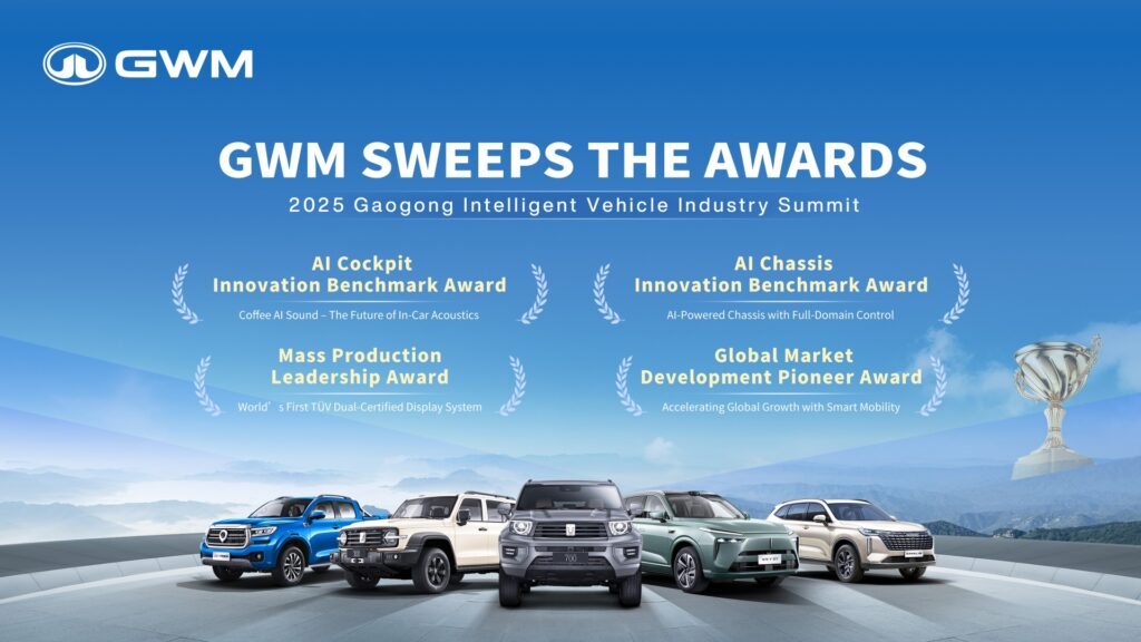 - รางวัล 2025 AI Chassis Innovation Benchmark: จากเทคโนโลยี AI Chassis ที่ยกระดับการควบคุมรถยนต์แบบองค์รวม ผสานระบบขับขี่อัจฉริยะ ห้องโดยสาร และการควบคุมยานพาหนะให้ทำงานร่วมกันได้อย่างไร้รอยต่อ ระบบสามารถประมวลผลแบบเรียลไทม์ ครอบคลุมทั้งการขับเคลื่อน 4 ล้อ เบรก การบังคับเลี้ยว และระบบกันสะเทือน มอบประสบการณ์ขับขี่ที่เหนือกว่าใน 4 ด้านหลัก ได้แก่ ความยืดหยุ่นสูง ความสบายเหนือระดับ การทำงานอัจฉริยะ และความปลอดภัยที่เพิ่มขึ้น ตอกย้ำบทบาทของ GWM ในการพลิกโฉมยานยนต์จากเพียง “พาหนะเพื่อการเดินทาง” สู่ “ยานยนต์อัจฉริยะในองค์รวม”