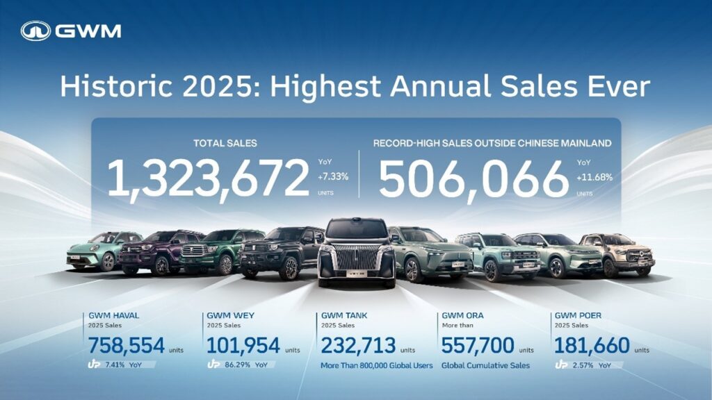GWM (Thailand) ยกระดับสู่การเป็นแบรนด์รถยนต์ที่มีผลิตภัณฑ์ครอบคลุมทุกประเภทพลังงาน ตอบโจทย์ผู้ใช้งานทุกกลุ่มทั่วโลก ภายใต้แนวคิด “All Scenarios – All Powertrains – All Users” พร้อมก้าวสู่การเป็นแบรนด์รถยนต์จีนที่คนไทยให้ความไว้วางใจสูงสุด และอันดับหนึ่งของแบรนด์รถยนต์จีนด้านบริการหลังการขายผ่านผลิตภัณฑ์ที่มีคุณภาพ เทคโนโลยีที่ล้ำสมัย และการดูแลลูกค้าด้วยความใส่ใจและโปร่งใสโดยในปี 2568 ที่ผ่านมา GWM ประสบความสำเร็จอย่างโดดเด่นด้วย ยอดจำหน่ายรวมทั่วโลก 1,323,672 คัน เติบโต 7.33% เมื่อเทียบกับปีที่ผ่านมา สร้างสถิติสูงสุดใหม่เป็นประวัติการณ์ ขณะที่ยอดจำหน่ายรถยนต์พลังงานใหม่ (NEV) อยู่ที่ 403,653 คัน เพิ่มขึ้น 25.44% ทำสถิติสูงสุดใหม่เช่นกัน และยอดจำหน่ายในตลาดต่างประเทศรวม 506,066 คัน เติบโต 11.68% เมื่อเทียบกับปีก่อน นับเป็นสถิติสูงสุดตลอดกาล สะท้อนถึงการเติบโตอย่างมั่นคงทั้งในเชิงปริมาณและคุณภาพบนเวทีโลก
