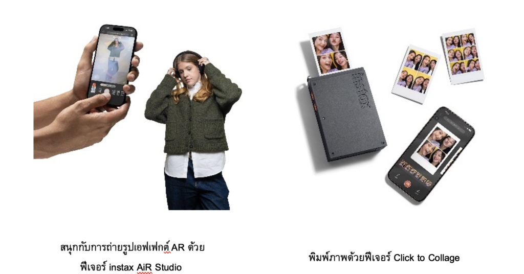 แอปพลิเคชัน instax mini Link ยังคงความสนุกด้วยฟีเจอร์จากซีรีส์ mini Link มาให้เล่นแบบจัดเต็ม ไม่ว่าจะเป็นการสร้างสตูดิโอ AR ส่วนตัวได้ทันทีด้วย instax AiR Studio™ หรือจะไปสนุกกับ Click to Collage ให้ฟีลลิ่งเหมือนได้ถ่ายรูปโฟโต้บูธ