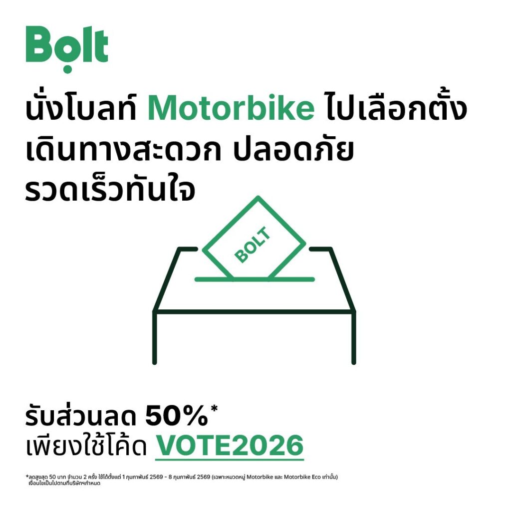 ในวันเลือกตั้ง ผู้ใช้บริการ Bolt สามารถรับส่วนลด 50% สำหรับบริการ Motorbike Eco และ Motorbike เพียงกรอกโค้ด VOTE2026 โดยส่วนลดมีมูลค่าสูงสุดไม่เกิน 50 บาทต่อเที่ยว และสามารถใช้ได้สูงสุด 2 เที่ยวต่อผู้ใช้ สิทธิพิเศษนี้ครอบคลุมช่วงวันเลือกตั้ง ตั้งแต่วันที่ 1-8 กุมภาพันธ์ 2026
