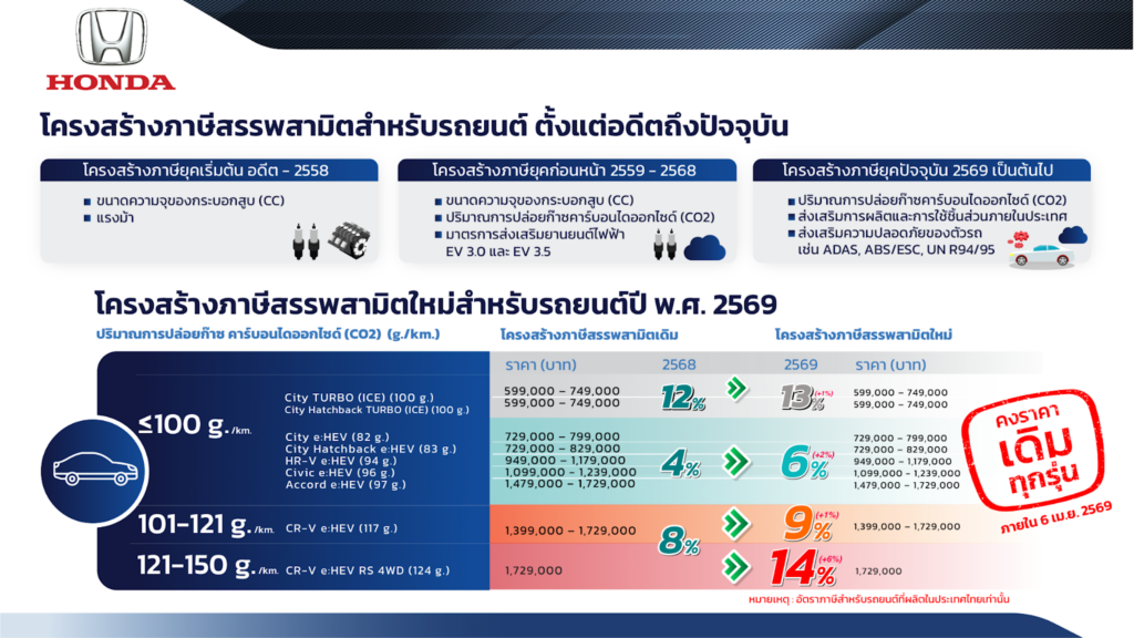 โครงสร้างภาษีสรรพสามิตใหม่สำหรับรถยนต์ปี 2569 และราคาขายรถยนต์ฮอนด้าถึงวันที่ 6 เม.ย. 2569