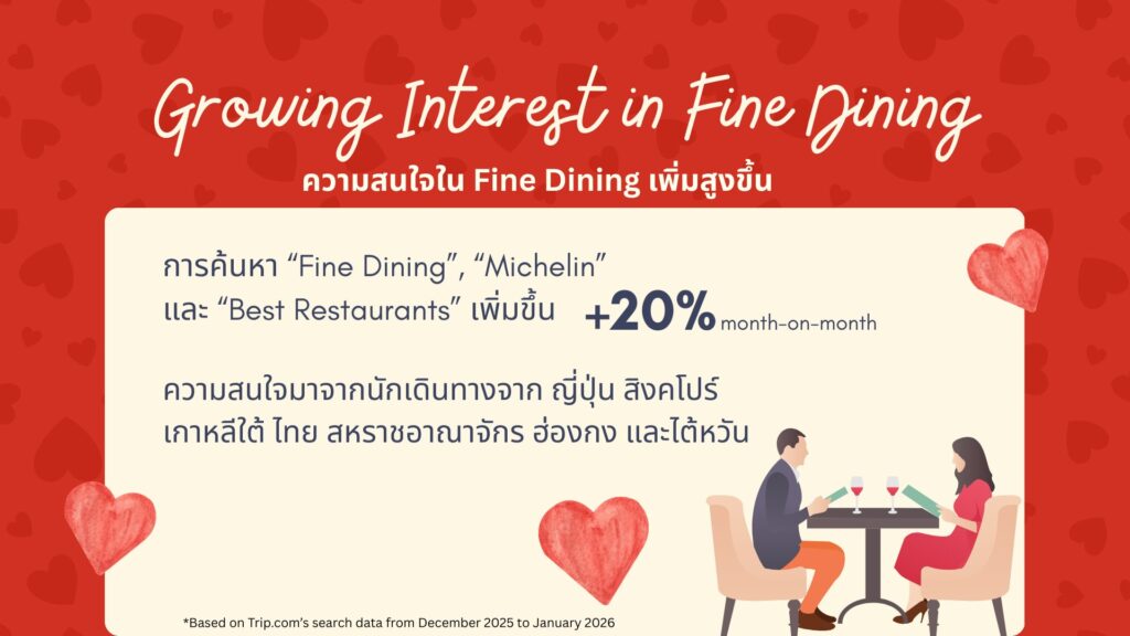 การสัมผัสประสบการณ์มื้ออาหาร โดยเฉพาะร้านระดับไฟน์ไดนิ่ง กำลังได้รับความสนใจอย่างมาก ข้อมูลล่าสุดจาก Trip.com ระบุว่ายอดการค้นหาร้านอาหารไฟน์ไดนิ่งมีจำนวนเพิ่มขึ้นอย่างต่อเนื่องทุกเดือน และสูงกว่าร้านอาหารทั่วไปอย่างชัดเจน โดยเทรนด์ดังกล่าวเกิดขึ้นในตลาดหลายแห่งทั้ง ฮ่องกง ไต้หวัน ญี่ปุ่น สิงคโปร์ เกาหลีใต้ ไทย และสหราชอาณาจักร[1]