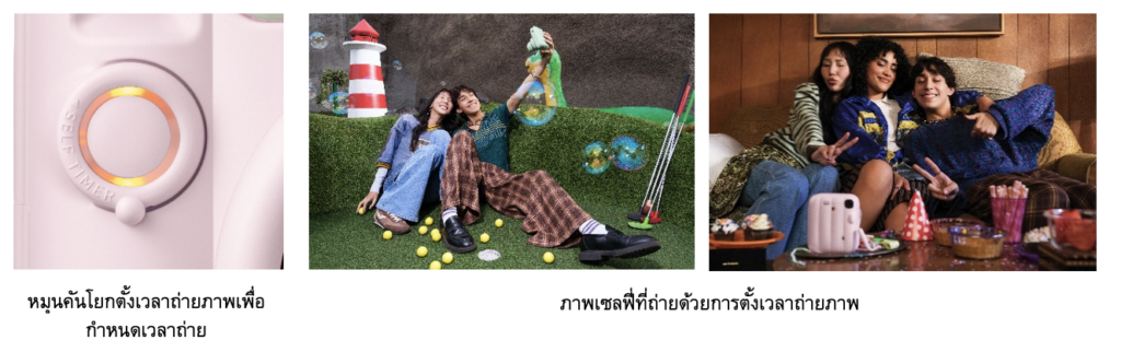 กล้อง instax mini 13 ใช้งานสะดวกเพียงหมุนเลนส์เพื่อเปิดกล้อง จัดเฟรม แล้วกดชัตเตอร์ก็ได้รูปทันที โดยครั้งนี้มาพร้อมฟีเจอร์ใหม่อย่างการตั้งเวลาถ่ายภาพ 2 วินาที และ 10 วินาที ใครเป็นสายเซลฟี่ก็ตั้งเวลาไว้ 2 วินาที จะช่วยให้จัดท่าโพสต์ได้ทันโดยไม่ต้องกังวลว่ากล้องจะสั่นตอนกดปุ่ม ส่วนการตั้งเวลา 10 วินาที ก็ช่วยให้ถ่ายมุมมองใหม่ในระยะต่าง ๆ ได้ตามใจ จะวางกล้องไว้แล้วถ่ายเต็มตัวก็ยังได้