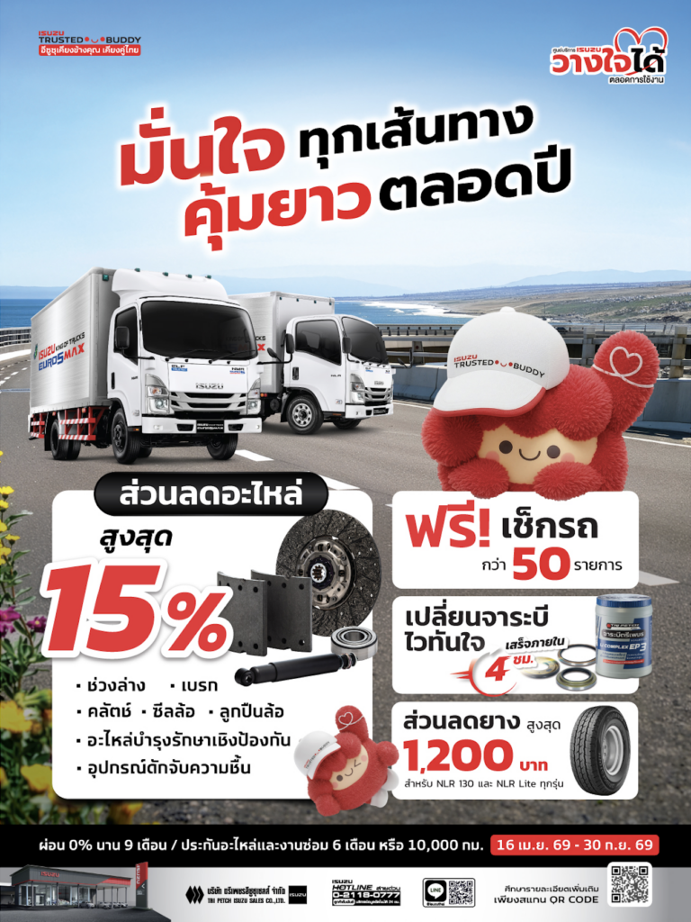 บริษัท ตรีเพชรอีซูซุเซลส์ จำกัด โดย คุณวิชัย สินอนันต์พัฒน์ รองกรรมการผู้จัดการ เชิญชวนเจ้าของรถอีซูซุเข้ารับบริการที่ศูนย์บริการมาตรฐานอีซูซุ พร้อมรับความคุ้มค่าในแคมเพจ์น “ได้ทั้งลด ได้ทั้งคะแนน” สำหรับรถปิกอัพและรถยนต์นั่งอเนกประสงค์อีซูซุทุกรุ่น และแคมเพจ์น “มั่นใจ ทุกเส้นทาง คุ้มยาว ตลอดปี” สำหรับรถบรรทุกอีซูซุขนาดใหญ่ (2 ตันขึ้นไปทุกรุ่น) ผ่านแอปพลิเคชัน my-ISUZU ครอบคลุมทั้งการประหยัด ดูแลรถครบ จบในที่เดียว เมื่อเข้ารับบริการที่ศูนย์บริการมาตรฐานอีซูซุทั่วประเทศ ตั้งแต่วันที่ 16 เมษายน 2569 ถึง 30 กันยายน 2569