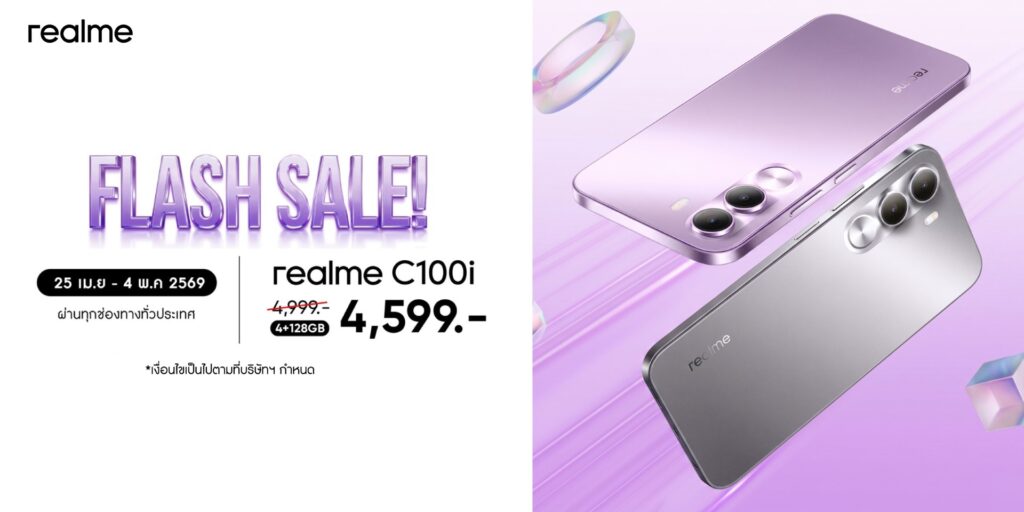 “realme FLASH SALE” จัดเต็มรับซัมเมอร์! ส่ง C100i มือถือ 7000mAhพลังอึด ทนทานระดับแชมป์ ด้วยมาตรฐานทหาร ท้าฝนท้าแดด ลดเหลือเพียง 4,599 บาท อย่าพลาด! โปรจัดหนักตั้งแต่ 25 เมษายน – 4 พฤษภาคม 2569 ผ่านศูนย์จำหน่ายสมาร์ตโฟนชั้นนำและผู้ให้บริการเครือข่ายทั่วประเทศ