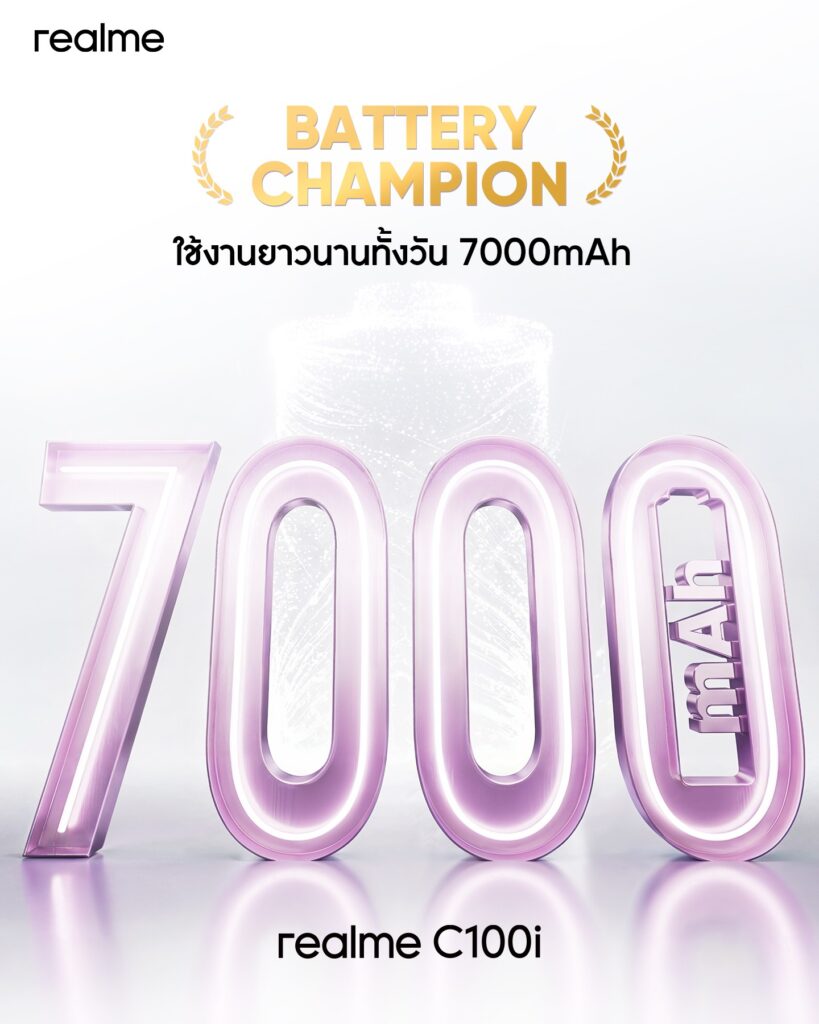 ไฮไลต์ของ realme C100i คือแบตเตอรี่ Titan ความจุถึง 7,000mAh ที่สแตนด์บายได้นานถึง 954.1 ชั่วโมง ตอบโจทย์คนที่ต้องอยู่นอกบ้านทั้งวัน ไม่ว่าจะขับรถส่งพัสดุ ลงไซต์งาน หรือเดินป่าตลอดวัน โดยไม่มีปลั๊กให้ชาร์จไฟ แถมระบบชาร์จเร็ว 15W และระบบชาร์จย้อนกลับ 6W ที่เปลี่ยนมือถือของคุณ ให้กลายเป็นพาวเวอร์แบงก์สำหรับอุปกรณ์อื่นได้ทันที พร้อมปลุกชีพหูฟัง สมาร์ตวอตช์ หรือมือถือเพื่อนร่วมทางได้ทันที