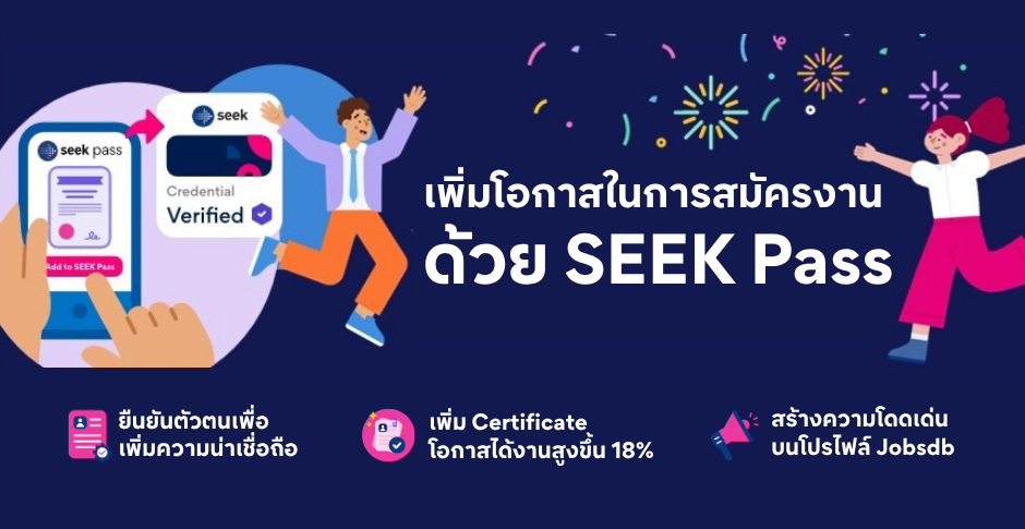 Jobsdb by SEEK แพลตฟอร์มหางานออนไลน์ชั้นนำของประเทศไทย ชูความโดดเด่นของ ‘SEEK Pass’ พาสปอร์ตดิจิทัลสำหรับการหางาน ที่ยกระดับโปรไฟล์ผู้สมัครงานให้โดดเด่นและน่าเชื่อถือผ่านการสร้างโปรไฟล์ที่สามารถตรวจสอบได้จริงในรูปแบบดิจิทัล โดยเปิดให้ผู้หางานสามารถยืนยันตัวตน, รับรองประวัติรวมถึงคุณวุฒิด้านการศึกษาและการพัฒนาทักษะ และแสดงผลสอบวัดระดับภาษาอังกฤษระดับสากล ทั้ง IELTS และ PTE (Pearson Test of English) บนโปรไฟล์ได้โดยตรง มุ่งสร้างมาตรฐานใหม่ในการสรรหาบุคลากรที่โปร่งใส แม่นยำ และช่วยให้คนทำงานชาวไทยโดดเด่นในตลาดแรงงานที่การแข่งขันสูงขึ้นในปัจจุบัน